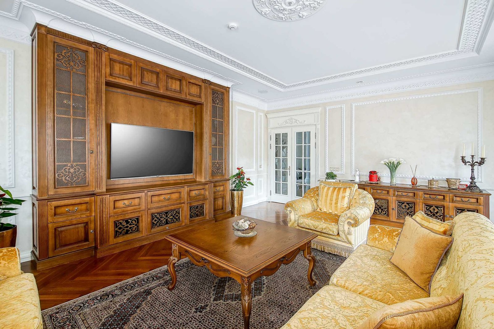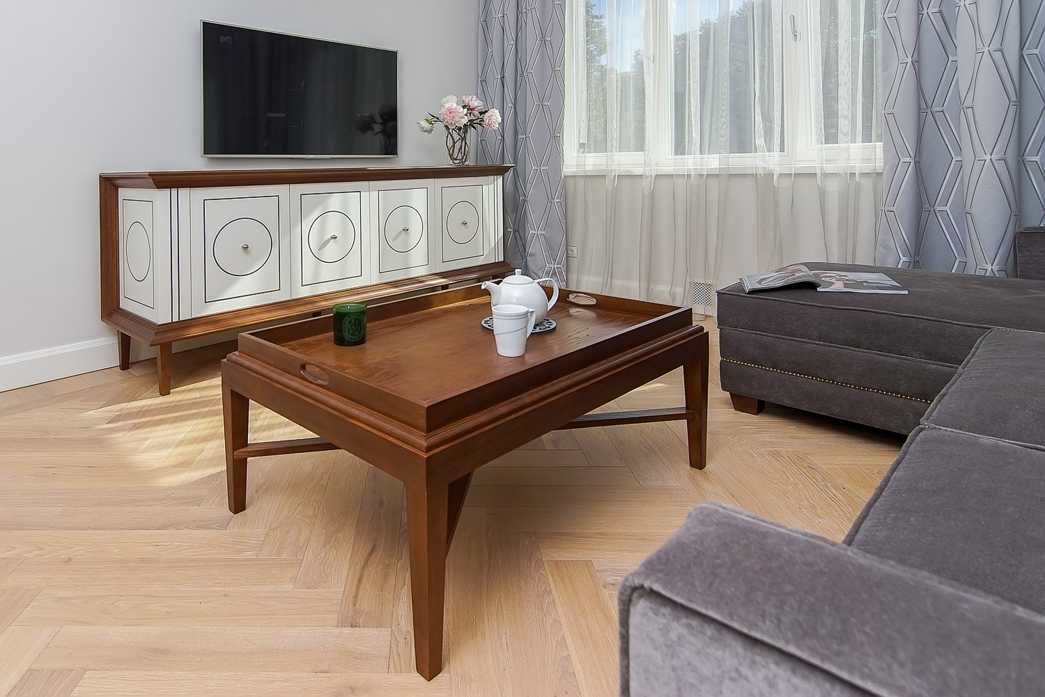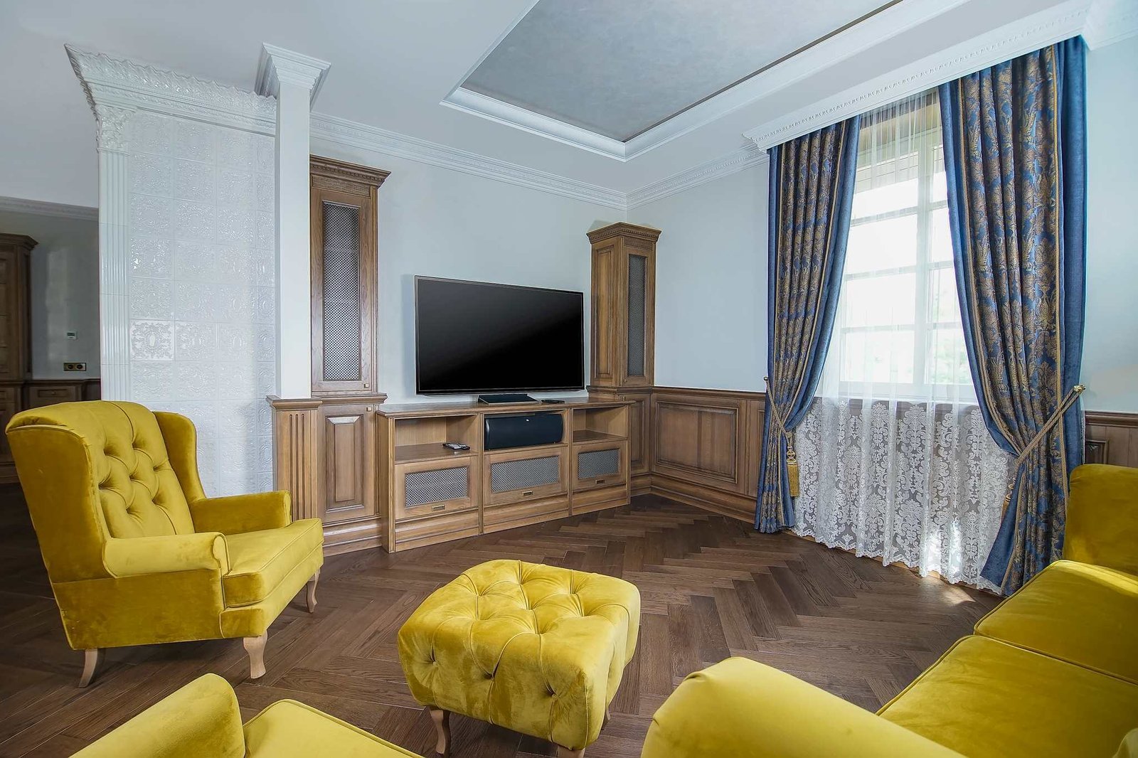 When you furnish the living room of your dreams along classical lines, you will inevitably come across the following hierarchy of furniture in the room: a sofa and its accompanying two massive armchairs, a dining table and a large rug. Whatever the size of the sofa, it is advisable to place it next to the windows in the room to create a clear division of zones. The dining area is another key area in the living room. In a classical living room, wooden tables of a relatively large size are usually used, with wooden chairs, or at least chairs with wooden motifs. It is recommended that the height of the table should be between 74 and 76 cm and the width around 60 cm. These dimensions will not only help to make the search for a table more concrete, but also to create a rational dining space in the living room. Of course, the carpet is also important - match the colour of this element of the room with the walls, curtains and cushions on the sofa.