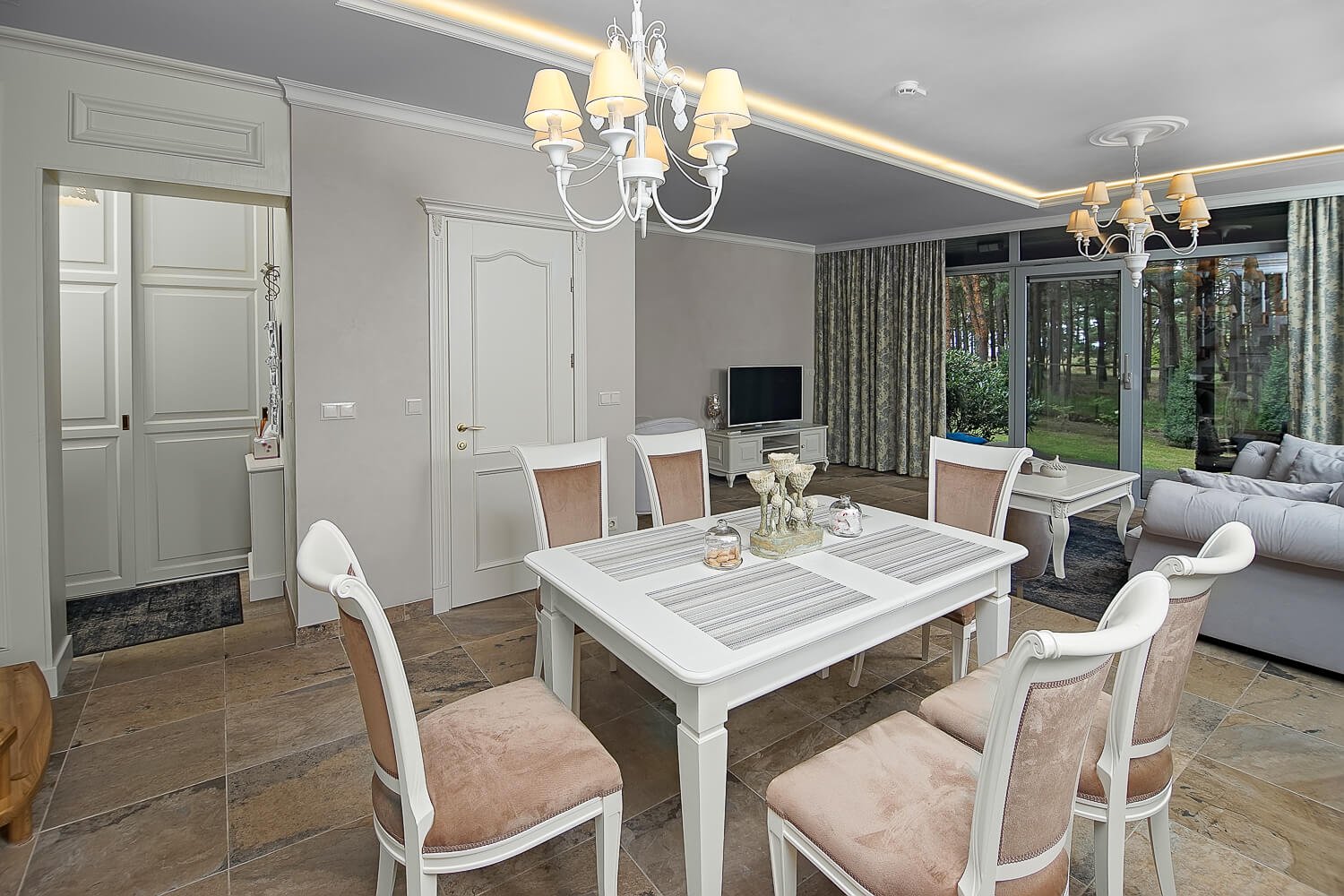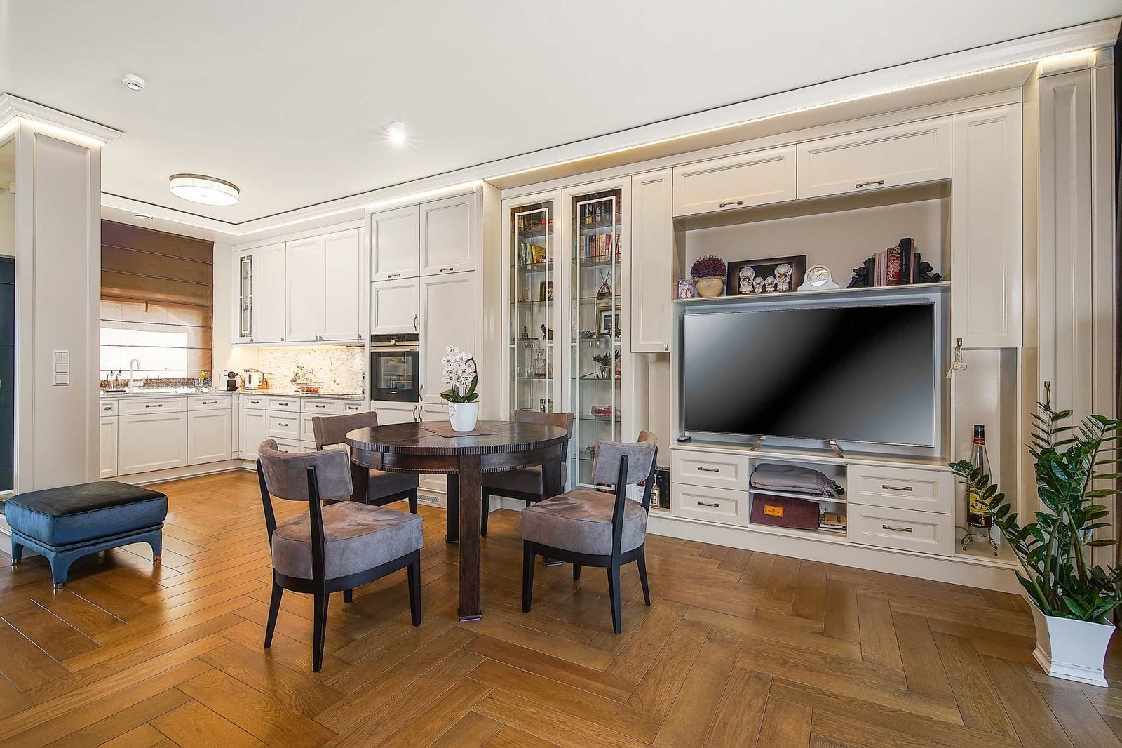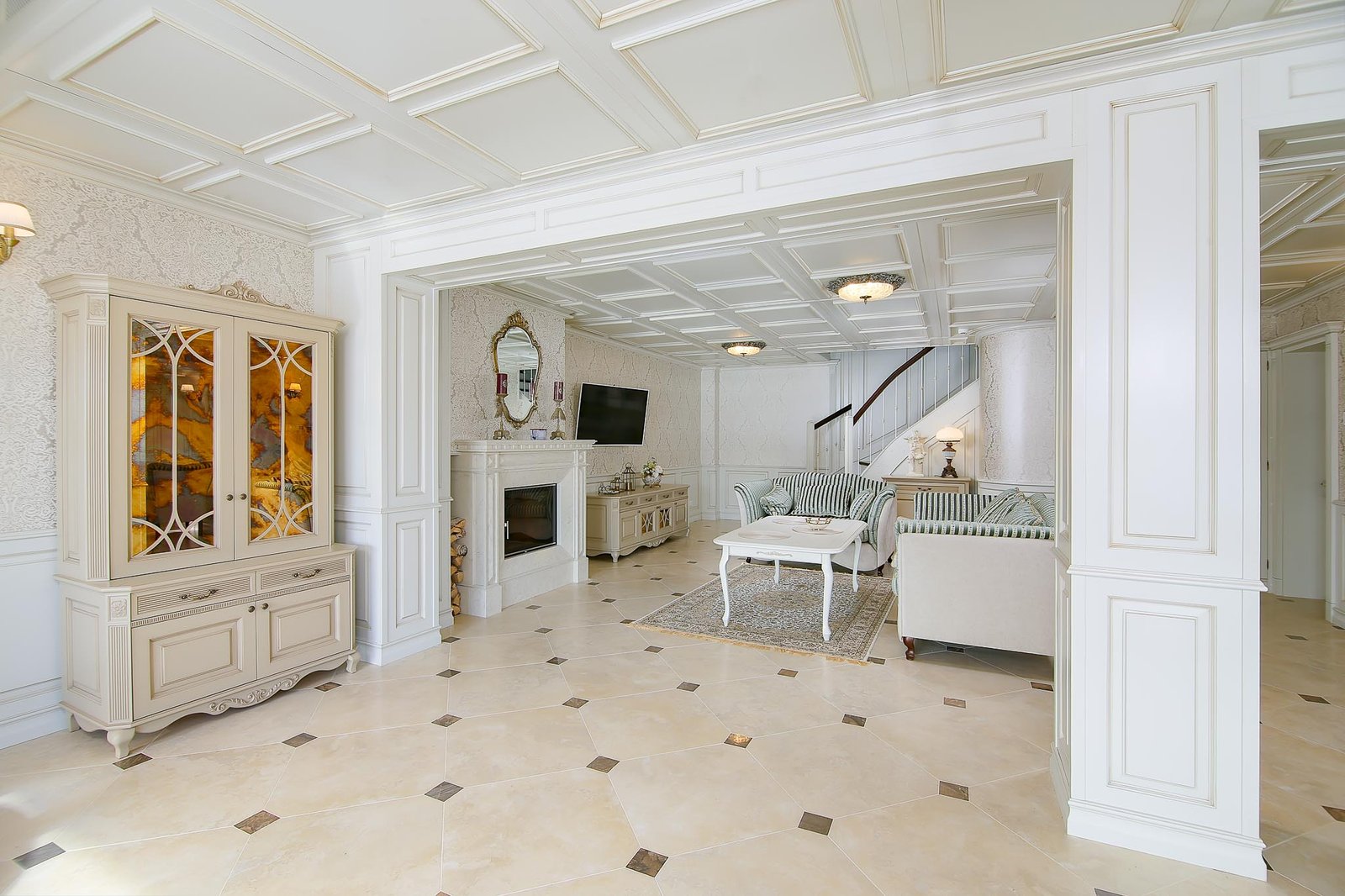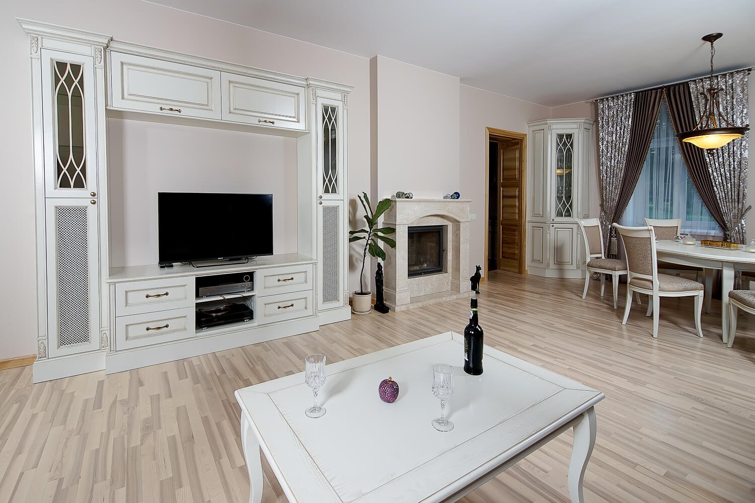 When you furnish the living room of your dreams along classical lines, you will inevitably come across the following hierarchy of furniture in the room: a sofa and its accompanying two massive armchairs, a dining table and a large rug. Whatever the size of the sofa, it is advisable to place it next to the windows in the room to create a clear division of zones. The dining area is another key area in the living room. In a classical living room, wooden tables of a relatively large size are usually used, with wooden chairs, or at least chairs with wooden motifs. It is recommended that the height of the table should be between 74 and 76 cm and the width around 60 cm. These dimensions will not only help to make the search for a table more concrete, but also to create a rational dining space in the living room. Of course, the carpet is also important - match the colour of this element of the room with the walls, curtains and cushions on the sofa.